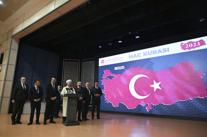 "2023'te, 2022'de 65 yaşından büyük olması ve aşı sebebiyle gidemeyen 34 bin 443 hacı adayımız kurasız bir şekilde hac ibadetini bu sene yapacaklardır. Ülkemize tanınan hac kotasının geriye kalan kısmı için ise ön kayıt yaptıran vatandaşlarımızın arasından, hac konaklama tercihleri ve ön kayıt yaptırdıkları yıllar ve kayıt sayısı oranları da esas alınarak kat sayılı bir şekilde kura çekilecektir."