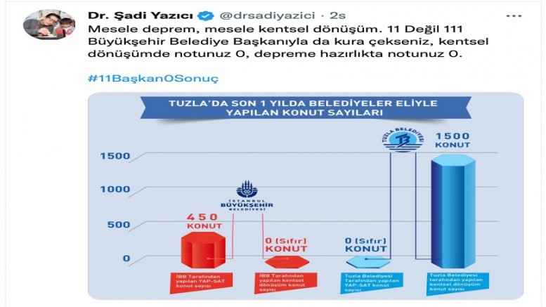 Tören sonrasında Tuzla Belediye Başkanı Dr. Şadi Yazıcı son 1 yılda Tuzla’da belediyeler eliyle yapılan konut sayısını paylaştı. Başkan Yazıcı, sosyal medya üzerinden paylaştığı grafikte, Tuzla Belediyesi’nin kentsel dönüşüm çalışmaları kapsamında 1500 konut yaptığını açıkladı. Başkan Yazıcı, İBB’nin Tuzla’da hiçbir yerde kentsel dönüşüm çalışması yapmadığını belirterek 450 konutta Yap-Sat modeli uyguladığını açıkladı. Başkan Yazıcı,” Mesele deprem, mesele kentsel dönüşüm. 11 Değil 111 Büyükşehir Belediye Başkanıyla da kura çekseniz, kentsel dönüşümde notunuz 0, depreme hazırlıkta notunuz 0” ifadelerini kullandı.