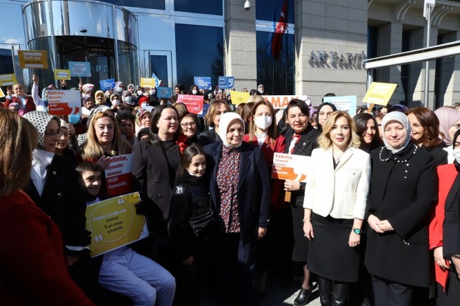 Öte yandan AK Parti'li kadınlar, "Kadın yönelik şiddetle mücadelede kararlıyız.", "Kadınlar siyasetin nesnesi değil öznesidir.", "Kadınlara karşı ayrımcılık ırkçılıktan beterdir." yazılı dövizler taşıdı.