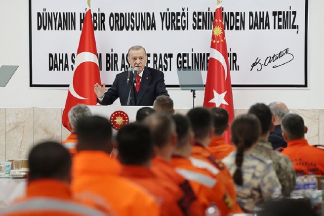 Erdoğan, enkaz kaldırma, yardım ve güvenlik çalışmalarında görev alan komutanından erine kadar tüm askerlere şahsı, ailesi ve milleti adına şükranlarını sundu, depremlerde hayatını kaybedenlere ve askerlere Allah'tan rahmet, yakınlarına başsağlığı diledi.