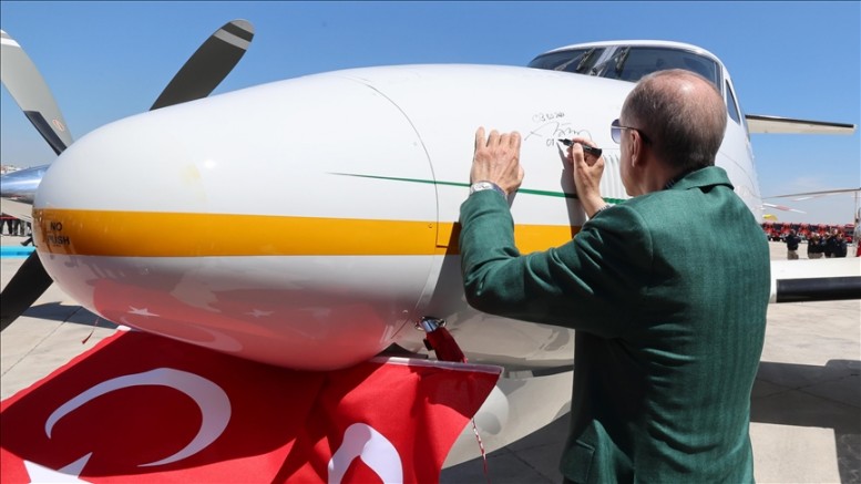 Erdoğan, ilk olarak yüksek teknolojiye sahip insanlı keşif uçağını inceledi. Bakan Kirişci'den uçak hakkında bilgi alan Erdoğan, bu uçağa "OTAĞ" ismini verdi. Erdoğan, uçağın gövdesine 3 Mayıs 2023 tarihiyle "OTAĞ" ismini yazdı, imzasını attı.