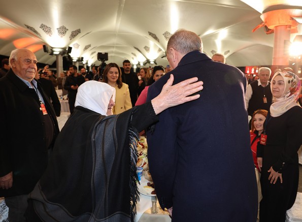 Bağcılar Belediyesinin vatandaşlara yönelik düzenlediği iftar programında Cumhurbaşkanı Erdoğan'ın masasında şehit yakını, depremzedeler ve engelli sporcular yer aldı.