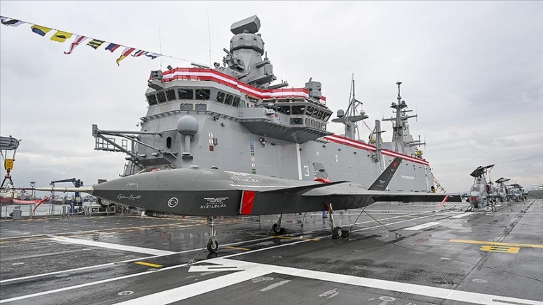 TCG Anadolu'nun teslim töreninde, geminin uçuş güvertesinde, Baykar tarafından geliştirilen Türkiye'nin ilk insansız savaş uçağı Bayraktar Kızılelma ve kanatları katlanabilen Bayraktar TB3 SİHA da yer aldı.