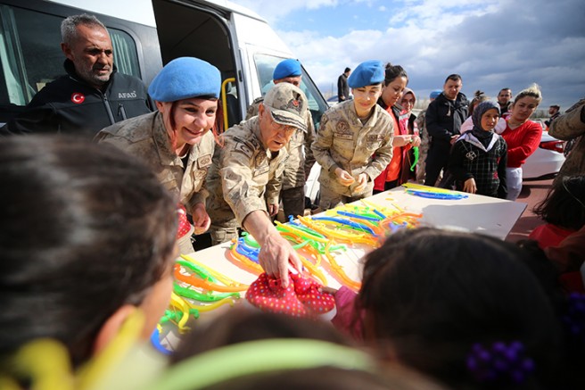 Çetin ve Bingöl, daha sonra Mehmetçik ile çocuklara oyuncak verdi.
