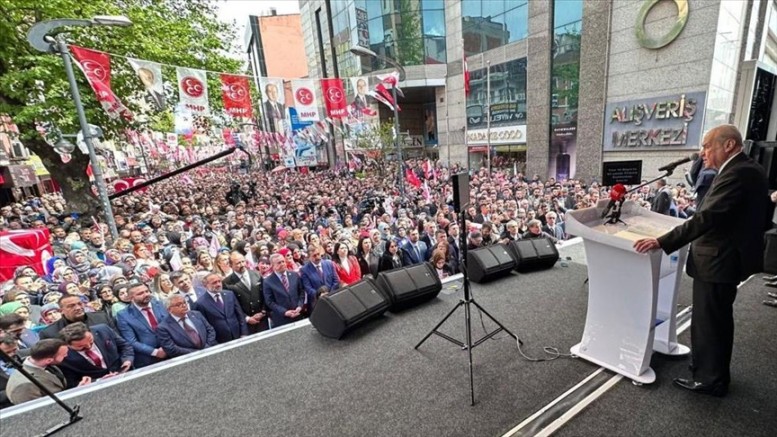 Partisinin Karabük Kemal Güneş Caddesi'nde düzenlediği "14 Mayıs'ta Aziz Milletim Sıra Sende" temalı açık hava toplantısında konuşan Bahçeli, Cumhurbaşkanlığı ve 28. Dönem Milletvekilliği Genel Seçimleri'nin ülkenin dirliğine, milletin birliğine, insanın huzur ve refahına hayırlı ve kalıcı sonuçlar getirmesini diledi.