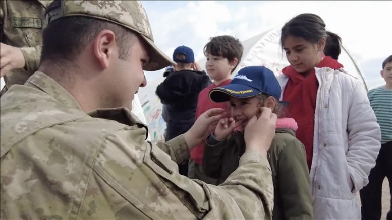 Paylaşımda askerlerin çocuklara SOLOTÜRK yazılı sweatshirt ve Deniz Kuvvetleri logolu şapkaları giydirdikleri görüntülere de yer verildi.
