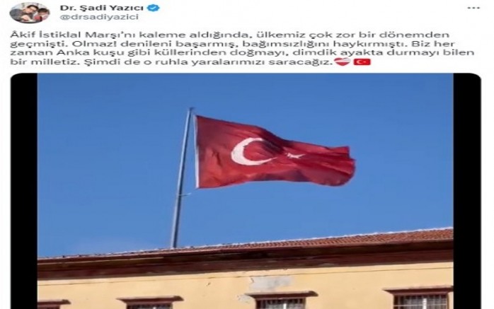 Başkan Yazıcı, sosyal medya hesabından yaptığı açıklamada,” Âkif İstiklal Marşı’nı kaleme aldığında, ülkemiz çok zor bir dönemden geçmişti. Olmaz! denileni başarmış, bağımsızlığını haykırmıştı. Biz her zaman Anka kuşu gibi küllerinden doğmayı, dimdik ayakta durmayı bilen bir milletiz. Şimdi de o ruhla yaralarımızı saracağız” ifadelerini kullandı. Başkan Yazıcı’nın Hatay’ın Kırıkhan ilçesinden dalgalanan dev Türk Bayrağı ile yaptığı paylaşım yoğun ilgi gördü.