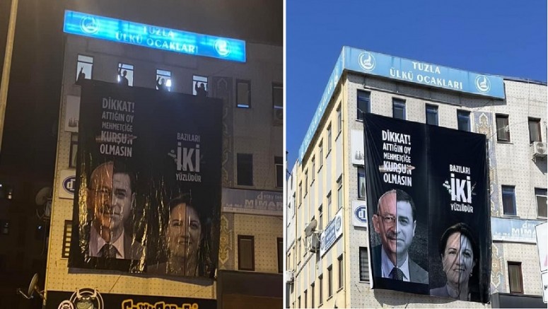 Diğer Afişte İse İyi Parti Genel Başkanı Meral Akşener İle HDP Eş Genel Başkanı Pervin Buldan'ın Birleşik Yüz Fotoğrafı Kullanıldı. Pankartta, "Bazıları İki Yüzlüdür" Yazıldı.